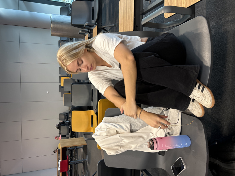 The scene depicts a young blonde female resting in a public waiting area within Istanbul Airport (IGA), Arnavutköy, Istanbul, Turkey. She is seated on a dark grey chair, facing slightly right, with her head lowered and eyes closed or cast downwards, suggesting repose or contemplation. She wears a white short-sleeved t-shirt, black loose-fitting trousers, and off-white Adidas sneakers with black stripes. Her arms are crossed on her knees, and her legs are drawn up with ankles crossed. In her right hand, she holds a pair of gold-framed eyeglasses. On the dark grey seat immediately to her left, a light grey hooded sweatshirt is folded. Next to the sweatshirt, a pink and blue gradient water bottle with volume markings and a clear lid stands upright. A black smartphone with a white protective case is positioned face-up on the seat beside the bottle. The environment consists of rows of interconnected dark grey and yellow public seating. In the background, a counter labeled "IGA Coworking" is visible to the left, with a red high-stool and partially visible individuals. Additional indistinct persons are seated further back. The walls are light grey paneled, and the floor is covered in dark carpeting. Large windows are present on the far right, suggesting an exterior view.