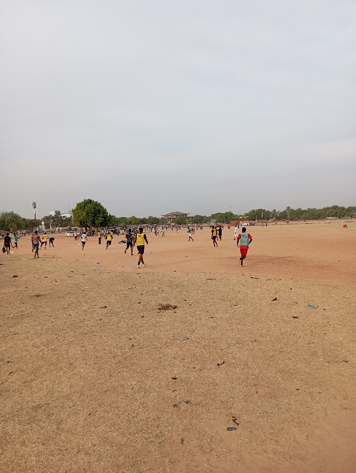 A wide, dry, grassy field under a pale sky is populated by numerous people running in various directions. They are dressed in casual athletic wear. A cluster of trees and a building are visible in the background along with a cell tower. There is also scattered trash on the ground.