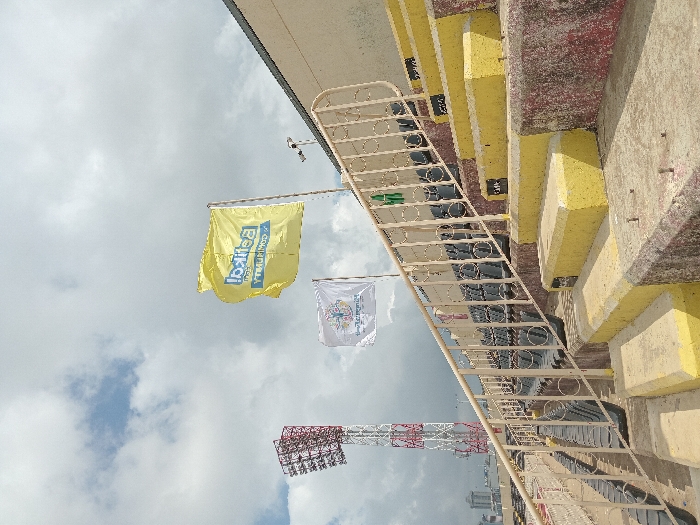 A low-angle view shows stadium seating with metal railings, yellow support structures, and weathered concrete. Two flags, one yellow with the word "Beilite" and another white with a colorful design, fly against a cloudy sky. A light tower is visible in the background.