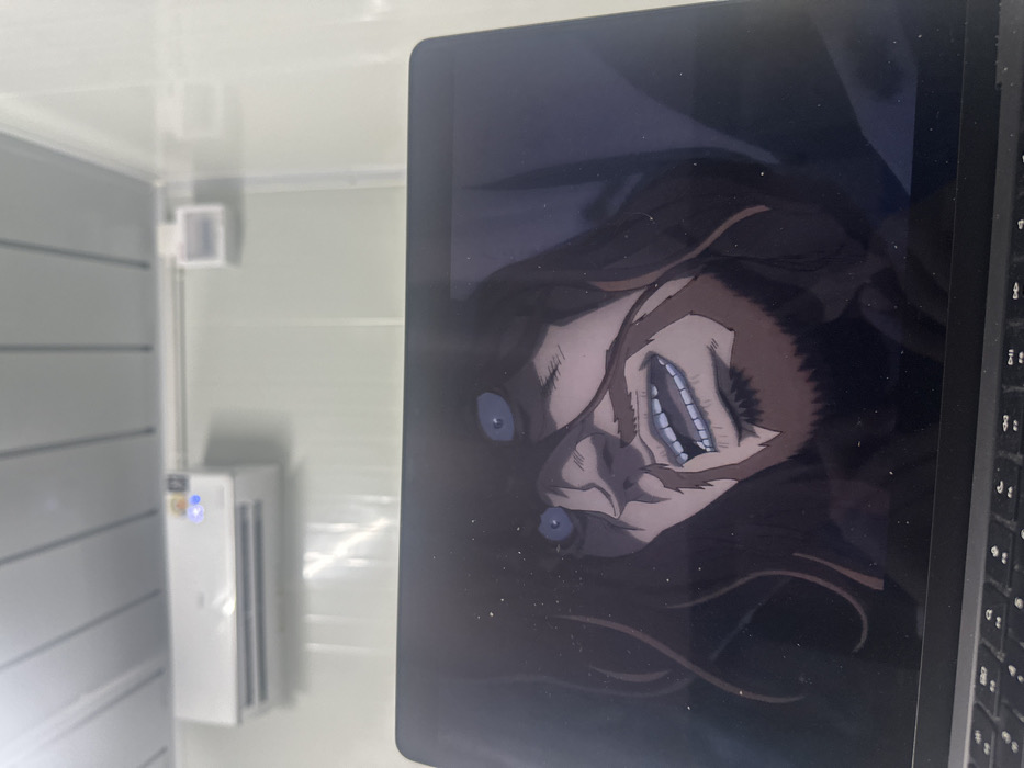 The image displays a black laptop computer positioned in an indoor setting in Nong Prue, Thailand. The laptop screen is primarily visible, showing an animated male character with long dark hair, a brown beard, wide-open blue eyes, and an open mouth revealing teeth, conveying an expression of distress or shock. The screen surface has visible dust particles. In the background, a light-colored wall, possibly white or off-white, features horizontal paneling. Mounted on this wall is a white wall-unit air conditioning system with an illuminated blue display. To the right of the air conditioning unit, a smaller white rectangular device is also affixed to the wall. No individuals are directly visible in the scene, only their implied presence interacting with the laptop.