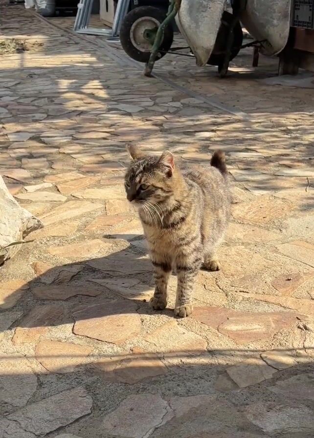 tabby cat standing on a stone-paved path in a backyard. The cat is light brown with dark brown stripes and a short tail. The cat looks around. Behind the cat, there is a wheelbarrow, some gardening tools, and a building. To the side, there is a wooden birdhouse. The sun is shining and casting shadows on the path.