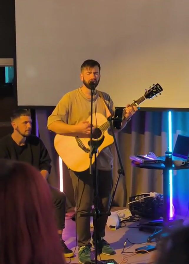 A man is singing and playing an acoustic guitar on a small stage in front of a crowd. He wears a tan t-shirt and gray pants. A microphone is on a stand in front of him. Another man sits to his left, playing a cajon drum. Behind them is a large white screen and a small table with a laptop, keyboard, and drinks. Blue and purple neon lights illuminate the backdrop. The crowd is visible in the foreground, with a few heads and shoulders in view.