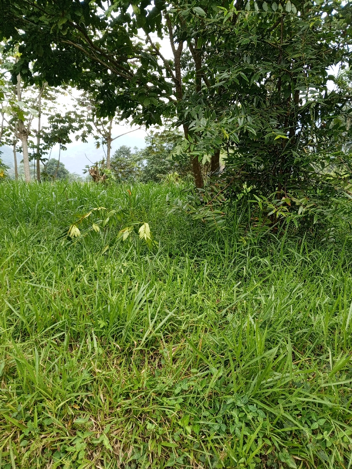 The image displays an overgrown outdoor natural scene in Thotagamuwa, Sri Lanka. The foreground is covered by a dense, unmanaged field of tall, vibrant green grass and assorted herbaceous ground cover. Scattered among the green are patches of dry, brown vegetation. In the midground, several trees are visible. On the left, multiple trees with pale, smooth trunks and sparse green foliage rise vertically. To the right, a tree with darker, textured bark and a denser canopy of smaller, ovate green leaves is prominent. A small shrub or plant with distinctively lighter green to yellowish leaves is partially visible, emerging from the tall grass in front of the darker-barked tree. The background shows a hazy, light-colored sky above a distant, undulating landscape covered in lush green vegetation, indicative of hills or mountains. No human presence, animals, or man-made structures are observed. The lighting suggests daylight conditions in an untamed, natural environment.