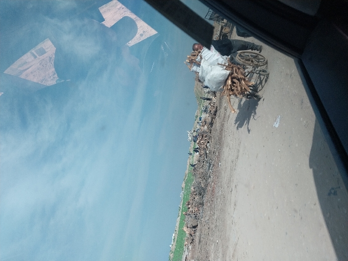 An outdoor scene in Az-Zahra, Palestinian Territory, captured from within a vehicle, looking out a side window. The upper portion of the frame features a light blue sky with wispy white clouds; reflections of indistinct structures are visible on the window in the upper right. The lower half of the image depicts an unpaved, light brown dirt road with scattered debris, including small pieces of white litter. A dark vehicle door frame is visible on the extreme right, and a shadow from the vehicle interior covers the lower left. In the midground, an adult male, wearing dark clothing, stands next to a two-wheeled cart on the dirt road. The cart is heavily loaded with firewood (tree branches and sticks) at its base, topped by large, white sacks. The man faces slightly away from the camera, looking towards the right. Behind him and to his right, a partial view of a yellow construction vehicle is visible. The background consists of a sprawling, desolate area characterized by numerous piles of dry brush, organic debris, and discarded materials. Several indistinct figures are visible among these piles in the distance. Further back, a low rise with patches of green vegetation can be seen under the horizon line.
