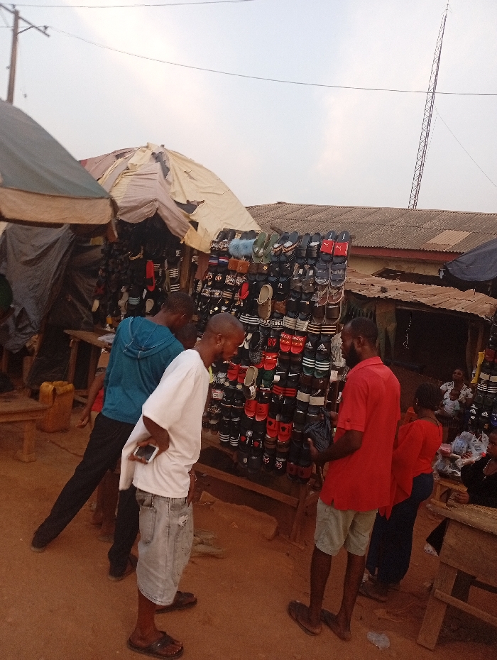 An outdoor marketplace features a shoe stall with numerous sandals displayed