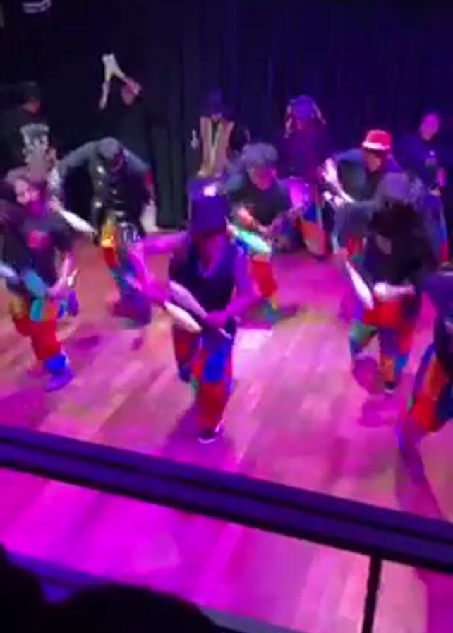 A group of about a dozen individuals, dressed in black shirts and bright, multicolored patchwork pants, are performing on a wooden stage. They hold white batons and move in unison, appearing to juggle or twirl them. The stage is bathed in pink and purple light. Behind them is a black curtain adorned with a white, scalloped trim. The camera is positioned above the stage, looking down at the performers.