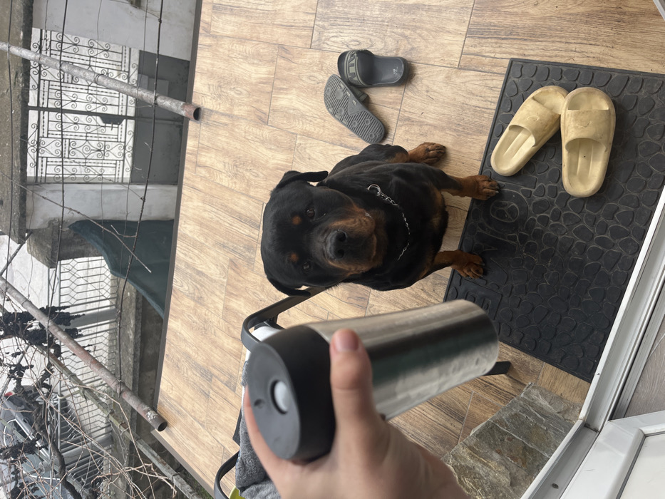 The image depicts an outdoor patio area in Kapitan Dimitrievo, Bulgaria, viewed from a slightly elevated indoor perspective. In the lower-left foreground, a human hand holds a silver insulated mug with a black lid and handle. Directly in front of the viewpoint, a black and tan Rottweiler dog, wearing a silver chain collar, sits upright on a black textured doormat, looking directly towards the camera. Two beige plastic slide-style sandals are positioned on the doormat to the right of the dog. To the dog's right, on the wood-patterned tiled floor, a pair of black athletic slides are discarded. The background features a dark metal railing, an area of bare tree branches or dormant vines, and a white residential structure with a white ornate gate. A dark green tarp is draped behind the railing, and a dark-colored vehicle is partially visible through the branches in the upper left. The sky appears overcast.