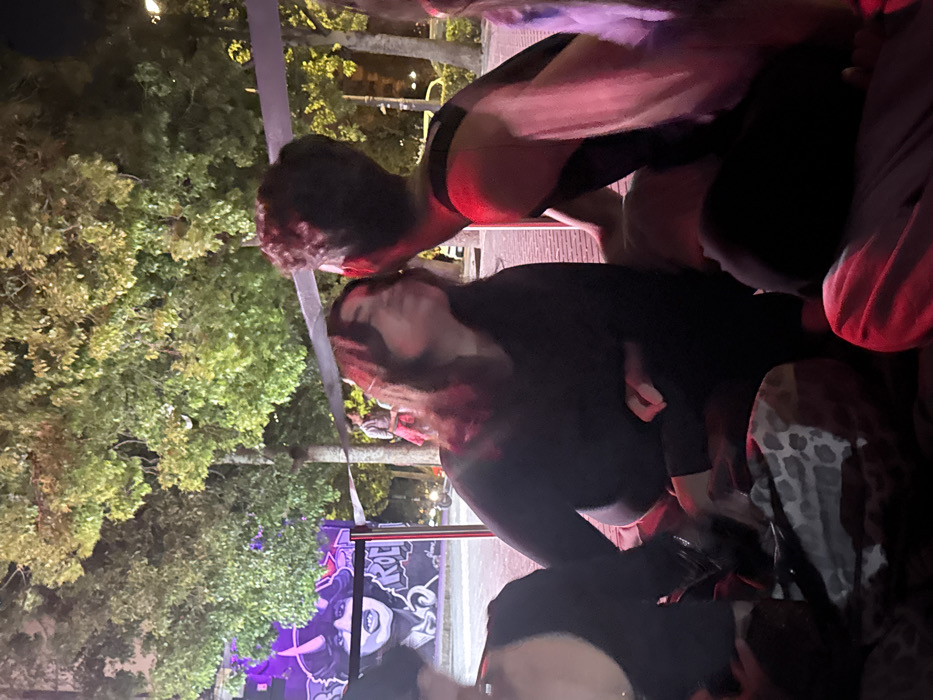 A nighttime scene depicts an informal outdoor gathering of at least four individuals in the Jardines del Turia, València, Spain, specifically within the skatepark area near the Pont de les Flors. In the foreground, a female with long, dark reddish-brown hair and a dark long-sleeved top is seated, her blurred face turned towards a male seated to her right. Her lap is covered by a patterned, possibly leopard print, fabric. The male, seen from behind, wears a dark sleeveless top; his head is turned towards the female, indicating an interaction. A strong red light source illuminates his right side and the rightmost edge of the frame, where a partial figure's leg and purple draped fabric are visible. To the left of the central female, a fourth individual is partially visible, wearing a dark, low-cut top with a textured sleeve. The background features a concrete wall, partially illuminated in purple, displaying a large graffiti artwork of a stylized, horned, open-mouthed face, resembling Angus Young from AC/DC, with the word "ROCK" visible below it. Tall trees with green foliage, illuminated by overhead lights, rise behind the wall. The ground visible behind the seated figures is paved with light-colored bricks. A dark horizontal metal bar extends across the mid-ground. In the further background, indistinct figures and vehicles are visible, illuminated by streetlights. The overall environment is an urban park setting at night, characterized by artificial lighting and street art.