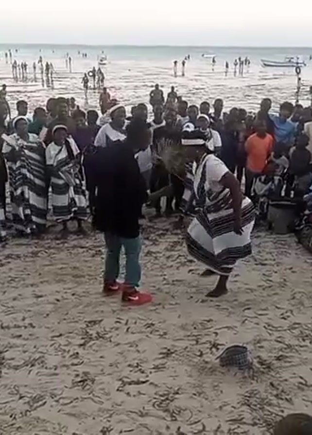 On a sandy beach with a crowd of onlookers, a person dressed in modern clothes faces a person in traditional attire, who is dancing barefoot. The dancer wears a white top and a skirt with black and white horizontal stripes, a white head covering, and holds a whisk-like object. Behind them, a line of people also in similar traditional striped clothing clap their hands. To the right, other individuals are seated, some playing drums. The background includes a shallow ocean with many people wading in the water. Several small boats can be seen further out. A person in the foreground is holding a smartphone, presumably recording the event.