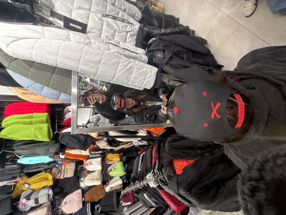The image depicts the interior of a clothing retail store located in Strasbourg, France. The scene is observed from a first-person perspective, with the back of a person's head and shoulders visible in the immediate foreground. This individual wears a black corduroy hooded garment and a black baseball cap featuring red "X" embroidery on the back and a red adjustable strap. A rectangular mirror, framed in silver, occupies the midground, reflecting two individuals and more of the store's merchandise. In the reflection, a person, likely female, wears a dark jacket, a gold necklace, and a black baseball cap with "53" in red numbers on the front. This individual is actively looking down at a smartphone held in both hands. Behind this person in the reflection, another individual, possibly taking the photo, holds a smartphone up and is seen wearing a dark top and a reddish-brown beret. Rings are visible on their fingers. The store's environment is densely packed with clothing items. To the left, numerous knitted hats and beanies of various colors (including yellow, green, red, pink, grey, black, and light blue) and styles are displayed on wall-mounted shelves and hangers. To the right of the mirror, several quilted puffer jackets are hung, including a light grey one with a "FRILIVIN" brand tag. Other jackets in black, olive green, and beige are also visible. Below the mirror, more dark jackets, including one with an orange lining, are on racks. The floor is covered with light grey tiles.