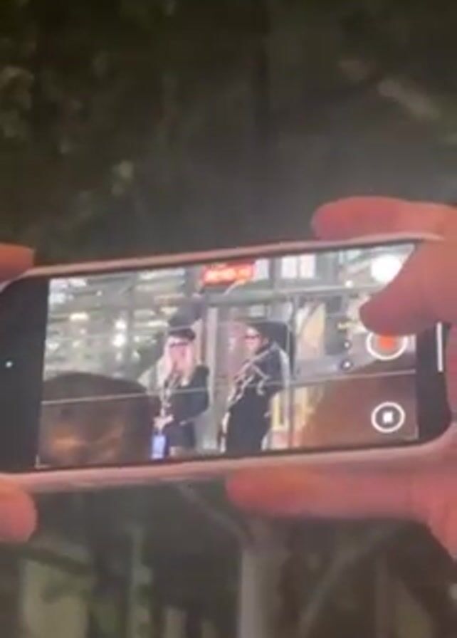 A person is recording a video on their smartphone of two people posing in front of a glass wall. The phone's screen shows the two individuals: a person with blonde hair wearing a black hat and jacket and another person in a black outfit with sunglasses. They are standing fairly close together. The environment seems to be outdoors, likely at night, with trees visible in the background. The person holding the phone is zoomed in a bit on the two figures. Other people's heads are visible in the lower portion of the frame.