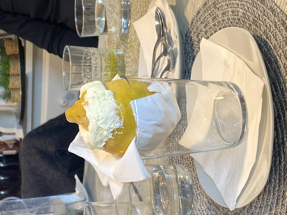 An indoor dining scene in Calvià, Spain, is captured, focusing on a dessert served at a table. A large, round, yellow pastry, possibly a *sfogliatella* or sweet bun, is centrally placed, resting within a clear glass and partially wrapped in a white paper napkin. The pastry is topped with a substantial amount of white whipped cream and a smaller, tapered, yellowish topping. In the immediate foreground, the glass holding the pastry sits on a small white plate, which is positioned on a circular, woven placemat of a light grey tone. To the left, another clear glass contains water. To the right and slightly further back, a white plate holds three silver spoons, placed on a white paper napkin. Behind these, two additional clear glasses are visible; one contains a small amount of yellowish liquid at its base, and the other is filled with water. The background is softly blurred, revealing a person wearing dark clothing seated at the table to the right. Decorative elements include several small potted plants in woven baskets arranged on a dark, circular tray on a white shelf or counter. Other indistinct objects and dark shapes suggest a restaurant or cafe environment.