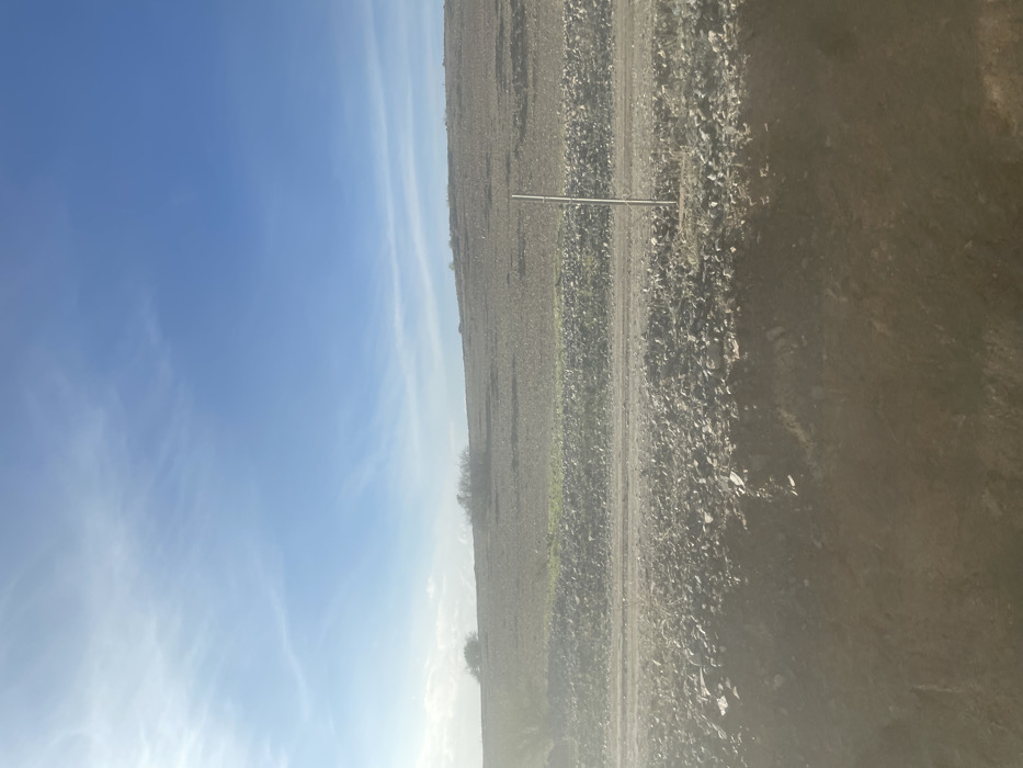 A landscape under a blue sky with wispy clouds. A dirt road runs across a barren field littered with rocks and gravel. A metal post stands in the middle of the field. The terrain appears dry and desolate, transitioning into a darker, shadowed area. Sparse vegetation dots the landscape, hinting at resilient life in the harsh environment.