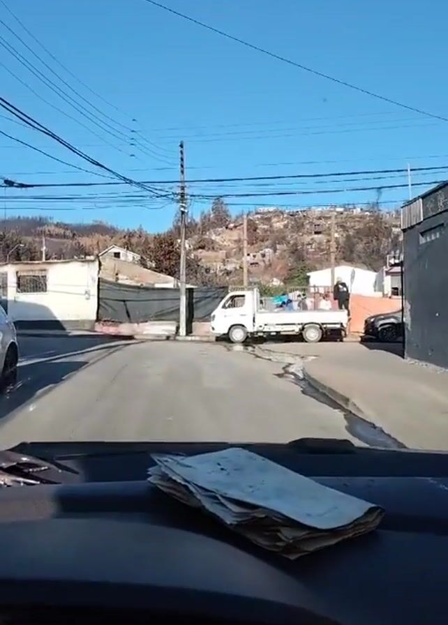 The camera faces forward from inside a vehicle, positioned at a stop on an asphalt road. In the foreground is the dashboard, covered with a pile of papers. Through the windshield, a white flatbed truck is parked to the right. Two people are visible in the bed of the truck. Behind the truck, the landscape includes houses and vegetation on a hillside. Many of the trees appear to have been burned. A utility pole is on the left side of the street. The sky is clear and blue.