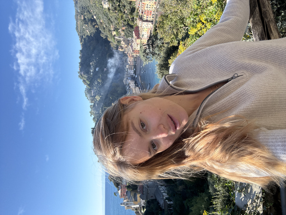 A female with long, light brown hair, wearing an off-white waffle-knit quarter-zip pullover sweater, is positioned in the foreground, captured in a selfie. Her lips are slightly parted, and her gaze is directed towards the camera. A wooden railing and yellow flowering plants are visible in the immediate foreground to her right. The background reveals an elevated panoramic view of Portofino, Italy. The iconic colorful buildings of Portofino's harbor are visible in the mid-ground, situated along the blue waters of the Ligurian Sea. Several small boats are moored within the harbor. A church steeple is visible on a prominent landmass to the left of the harbor. Steep, verdant hillsides, densely covered with trees and vegetation, encircle the village and extend into the distance. A plume of white smoke or mist is observed rising from the lower part of the hillside behind the central village area. The sky above is clear blue with sparse white clouds.