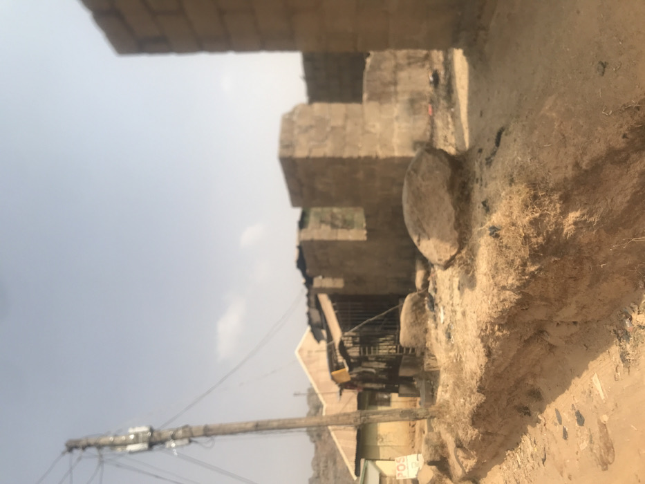The scene depicts a street view on Rukuba Road, Nigeria, under a hazy, light blue sky. In the foreground, a dirt road occupies the lower left, bordered on its right by an eroded dirt embankment. Large, rounded boulders rest on the elevated dirt surface. On the left midground, a wooden utility pole with multiple electrical wires and two mounted transformers or junction boxes stands upright. Behind this pole, a single-story building with light-colored walls and a corrugated metal roof is visible. An attached, makeshift stall or extension, constructed from corrugated metal and possibly wood, protrudes from the building, with a yellow container hanging from it. A white sign with "POS" in red lettering is partially visible near the base of the utility pole. To the right, a series of unroofed, unfinished or dilapidated structures made of tan-colored cinder blocks or mud bricks are present. These include an L-shaped foundation or partial wall section, and a tall, prominent wall segment extending off-frame on the far right. Scattered debris, including plastic items, is observed on the elevated ground between these structures. In the far background on the left, faint outlines of hills or mountains are visible beneath the hazy sky. No individuals or vehicles are present in the image.