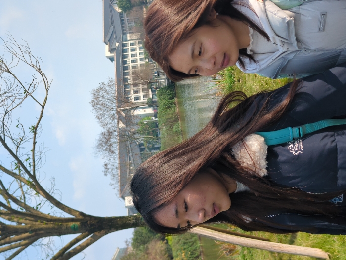 Two women stand closely together, facing downward with contemplative expressions. One wears a dark jacket with a fur collar and a teal strap. The other wears a light-colored puffy jacket. Behind them lies a grassy area near a body of water, reflecting a building with multiple windows under a blue sky. Bare tree branches are visible on the left. The overall scene has a peaceful, serene atmosphere.