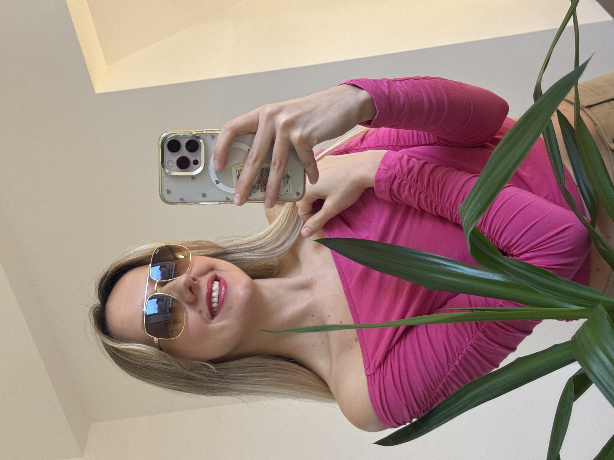 A fair-skinned woman is taking a selfie with her smartphone. She is wearing sunglasses, a pink top with gathered sleeves and neckline, and tan shorts. Her blonde hair is parted to the side. A potted plant with long green leaves partially obscures the view. The location appears to be indoors, under a plain white ceiling. The location in Carnikava, Latvia, is unknown.