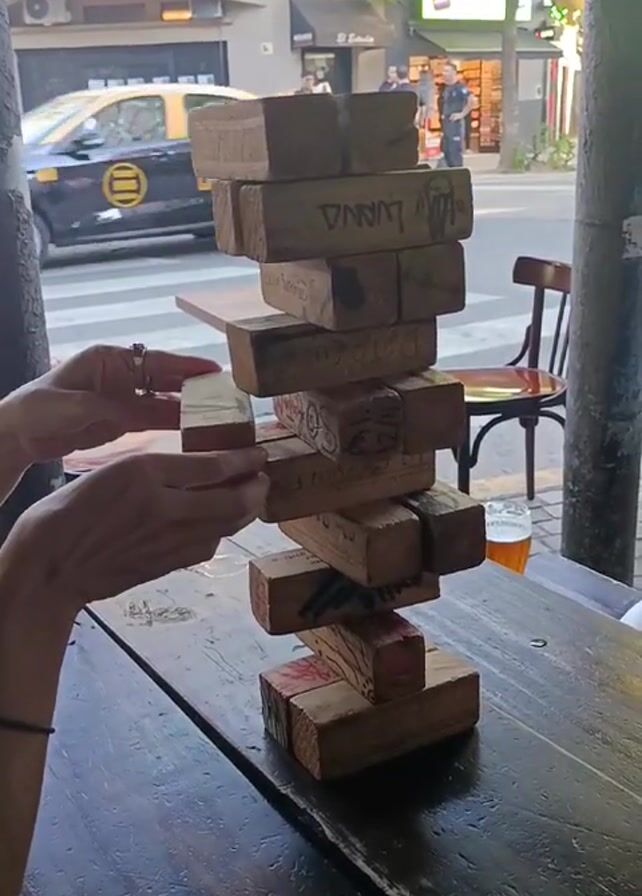 A pair of hands is seen gingerly removing a wooden block from the middle of a wooden Jenga tower, situated on a dark, weathered wooden table. The tower, adorned with scribbles and words, sits relatively stable. A glass of beer stands nearby, adding to the informal setting. Behind the table and tower, a partial view through a doorway reveals a street scene with pedestrians, a cyclist, and parked cars, lending an urban backdrop to the game in progress.