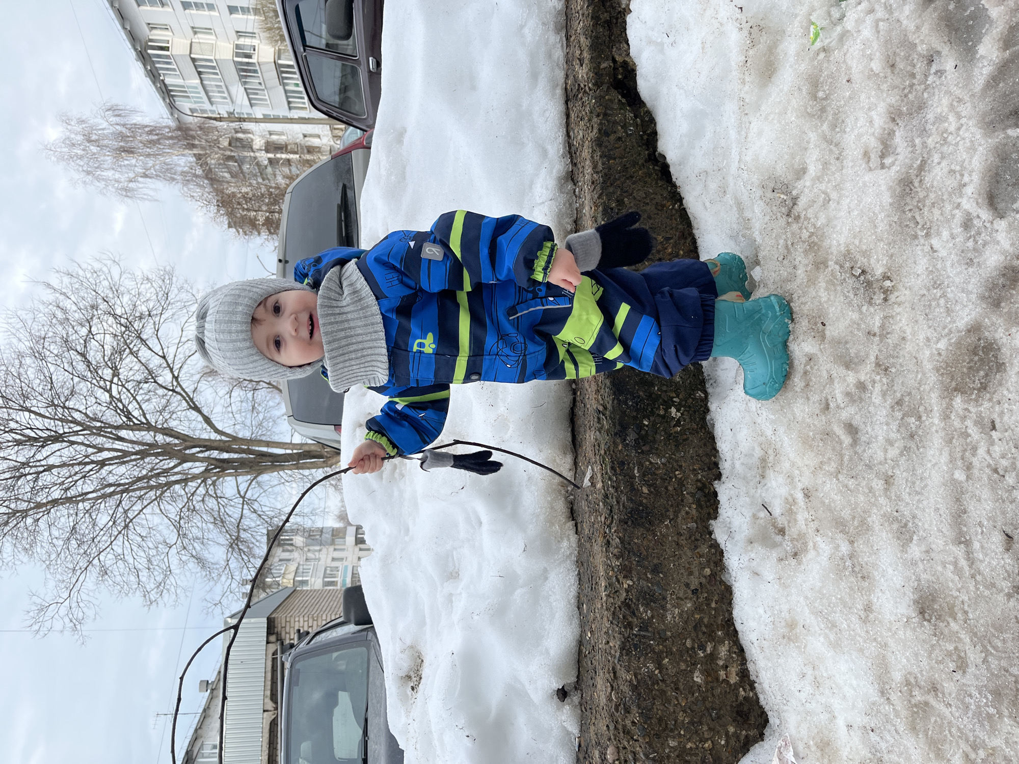 A young child stands near a snowbank next to a curb in what appears to be a city environment. The child wears a blue and green striped snowsuit, grey hat and scarf, blue rubber boots, and mismatched gloves, holding a twig in one hand and a glove in the other. The snowbank is melting, with patches of exposed asphalt visible. Cars are parked nearby, and multi-story residential buildings are visible in the background. The scene appears to be from Chaikovsky, Russia.