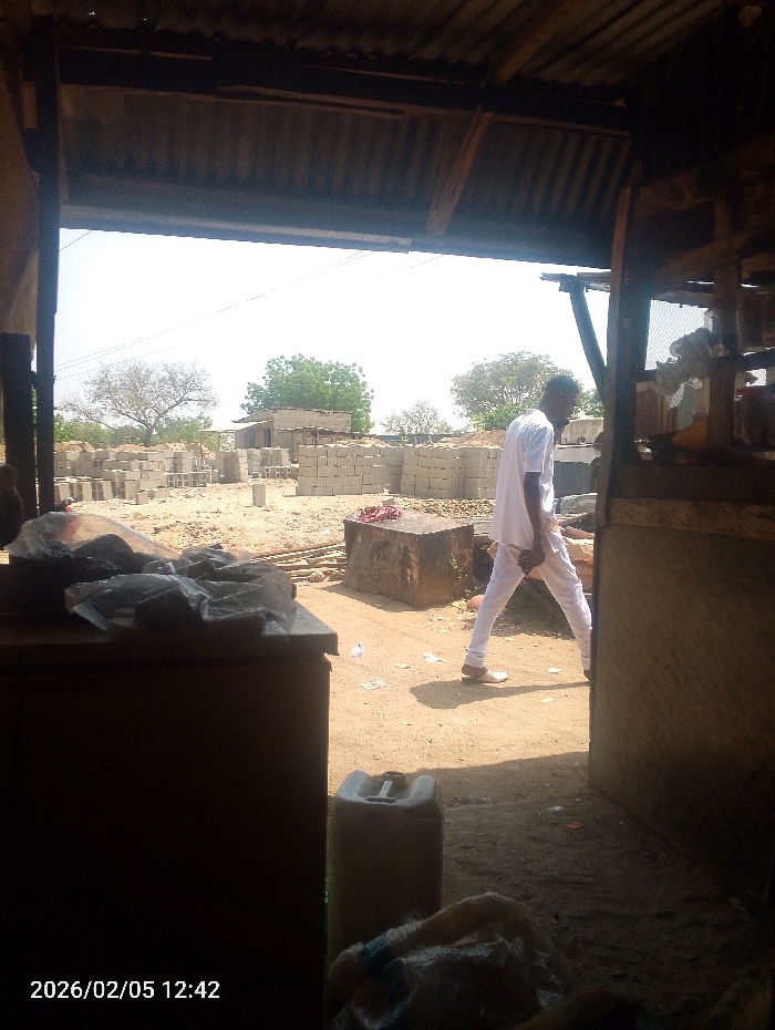 The image depicts an outdoor scene in Adankolo, Nigeria, viewed from within a dimly lit structure with a corrugated metal roof supported by wooden beams. The exterior is brightly illuminated by daylight. In the foreground, to the left, a dark wooden counter displays several items wrapped in clear plastic. On the dirt floor to the right, a light-colored plastic jerrycan stands next to a partially visible bundled sack. In the mid-ground, a male individual walks from left to right, dressed in a white long-sleeved shirt and white trousers. He is oriented with his head slightly turned left, and his right arm is bent. The ground is bare earth, scattered with small pieces of debris. A rusty, dark metal container sits behind the walking individual. The background reveals an open-air facility characterized by numerous organized stacks of concrete blocks or bricks. Behind these stacks, a small, simple structure with a metal roof is visible. Several trees with green foliage are present further in the distance against a light, clear sky. The bottom left of the image displays a timestamp: "2026/02/05 12:42".
