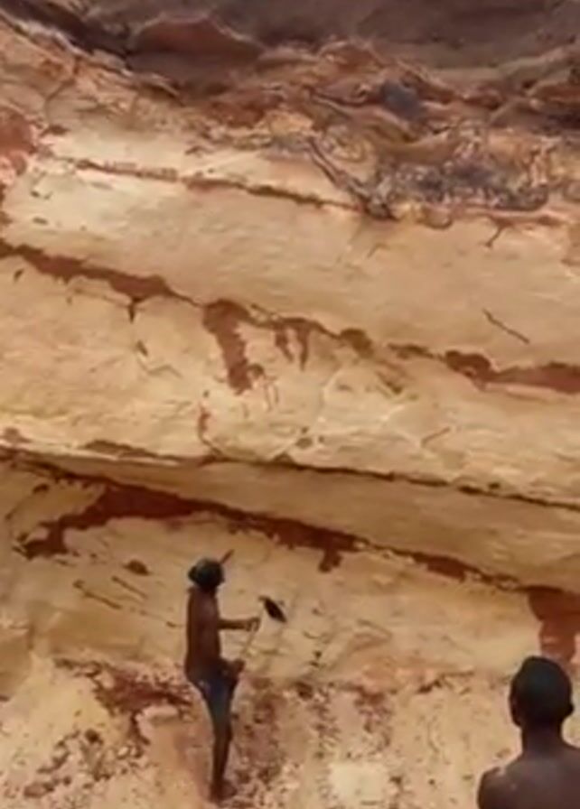 Two dark-skinned men are at the base of a tan and brown striped rock cliff. The man closest to the camera is wearing dark shorts. The other man is higher on the cliff face, wearing shorts and a head covering, using a tool that appears to be a hatchet to chip at the rock face. Fragments of rock are at the base of the cliff.