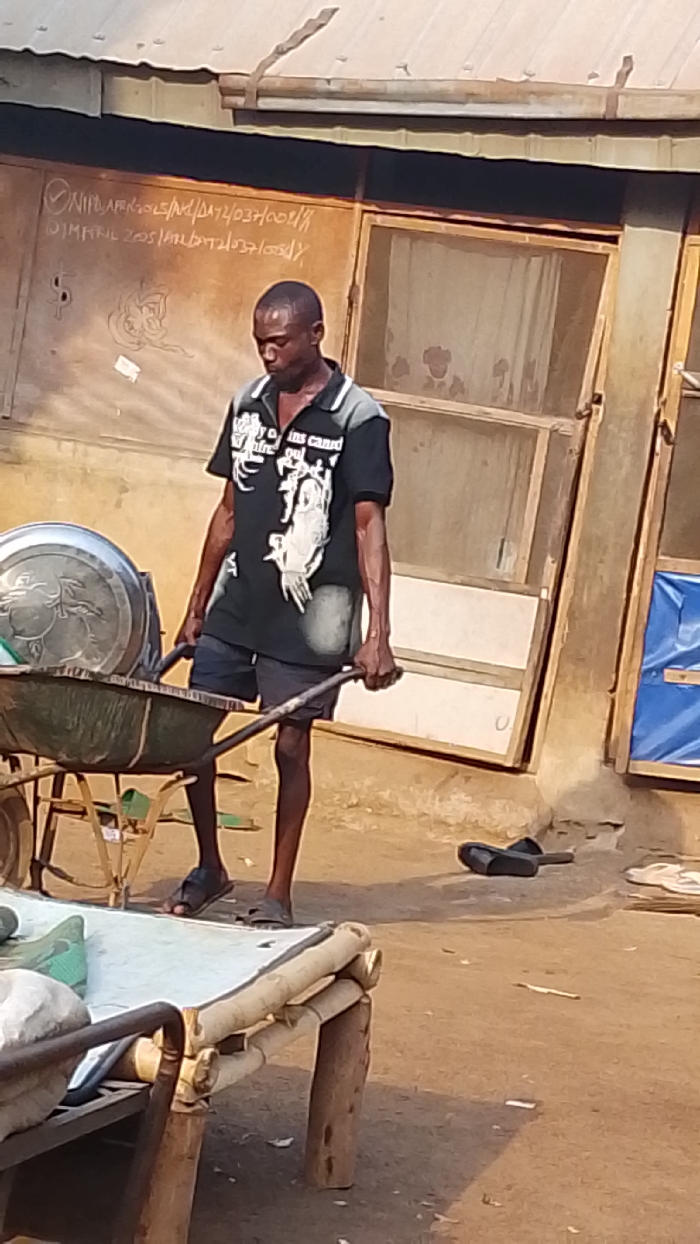 A man in a black polo shirt and dark shorts is pulling a wheelbarrow loaded with metal dishes. He is wearing sandals. He's standing outside a building with writing on the wall. A makeshift bed is nearby, made of wood and fabric. A pair of black sandals lie on the ground near the building. The scene appears to be a residential area with simple structures.
