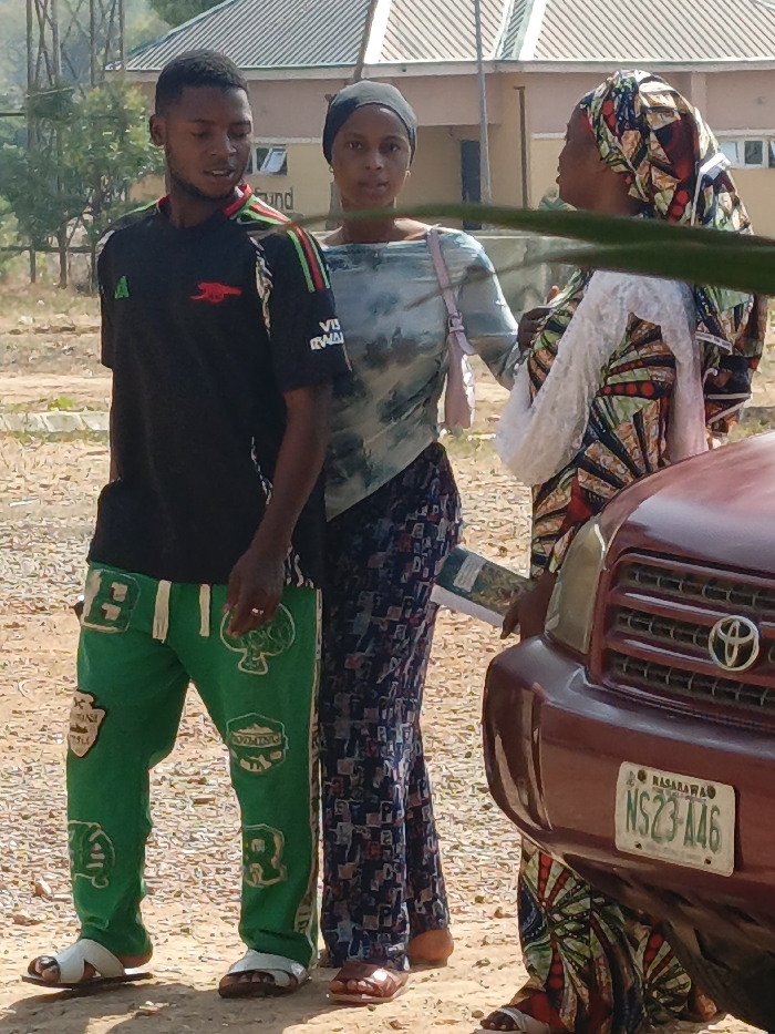 Three people stand near a maroon car with a "NASARAWA" license plate "NS23-A46." A man wears a black t-shirt, green pants adorned with various patches, and white sandals. To his right, a woman in a headscarf is dressed in a patterned top and pants, carrying a bag. The third individual, also a woman in a headscarf and patterned clothing, stands closest to the car. They appear to be engaged in conversation.