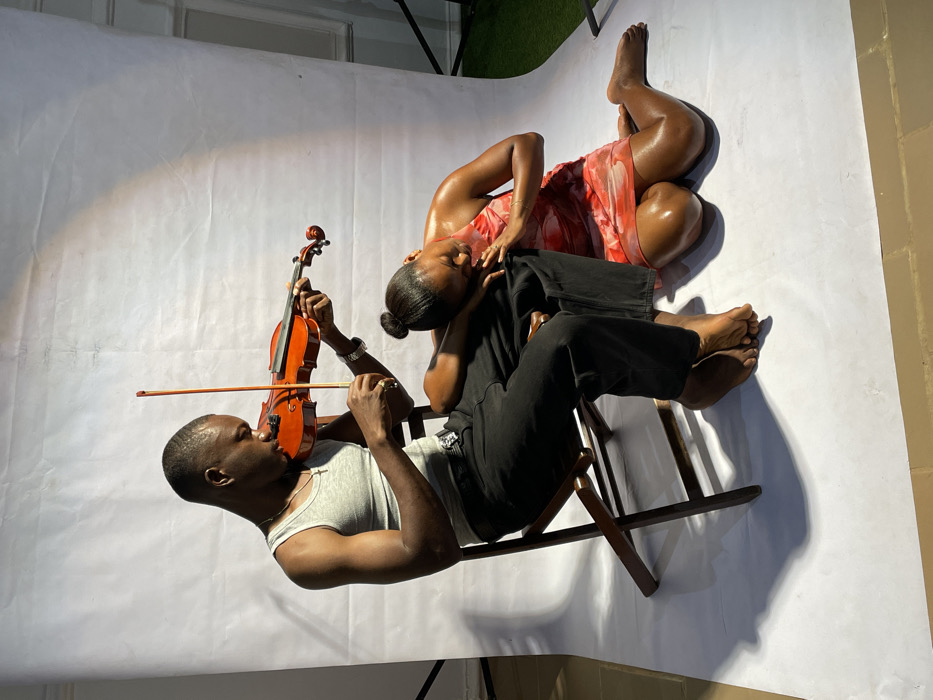The scene depicts two dark-skinned individuals in an indoor photography studio located in Barakin Akawo, Nigeria. A male subject is seated on a dark brown wooden folding chair, facing slightly left. He is barefoot, wearing a grey ribbed tank top, black pants with a silver belt buckle, a silver chain with a cross pendant, a silver bracelet on his left wrist, and a ring on his right hand. He holds a brown violin against his left shoulder and chin, actively drawing a bow across its strings with his right hand, his eyes focused downwards. To his right, a female subject is kneeling on the white seamless backdrop that covers the floor. She is barefoot, wearing a short red and white patterned halter-neck dress, and has her dark hair styled in a bun. Her head is resting on the male's left thigh, with her right hand positioned near her mouth and her left arm resting on his leg. The white backdrop extends upwards, creating a uniform background, with a portion of light-colored tiled floor visible at the very bottom edge and a sliver of green artificial turf with studio equipment visible on the far right background.