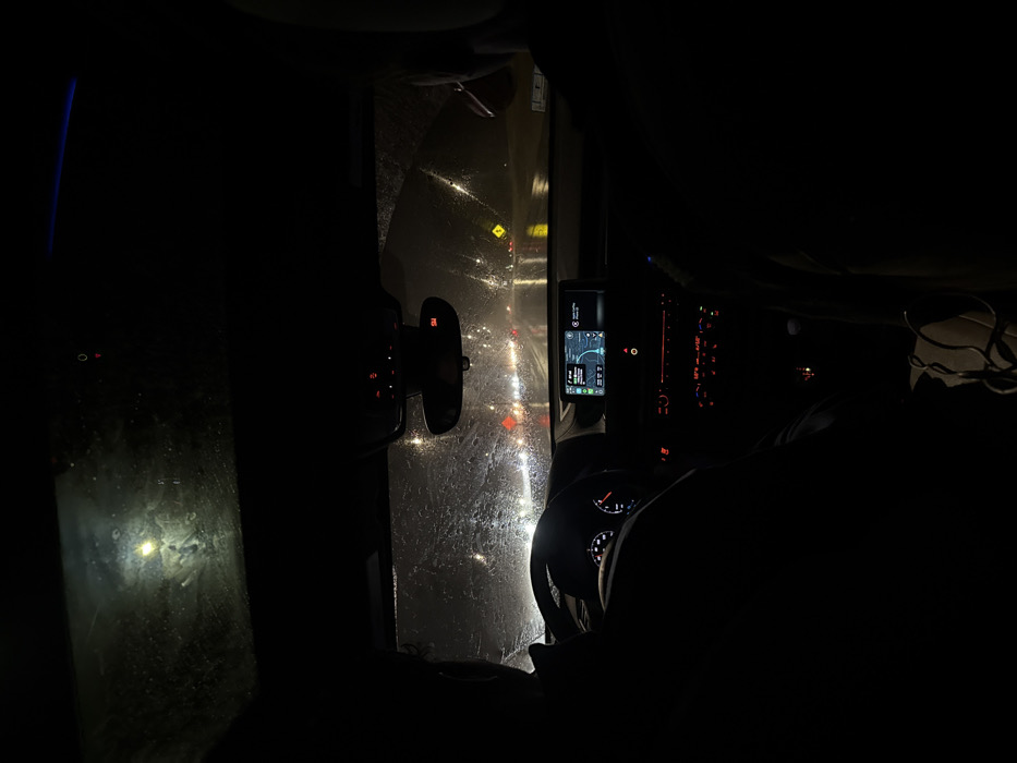 The image depicts the interior of a vehicle at night, viewed from a rear passenger seat looking forward