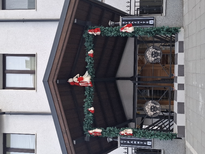 The image displays the entrance of a building identified as "СТРАЖИТЕ" (STRAZHITE) in Bansko, Bulgaria. The structure features a white stucco facade with dark brown framed windows fitted with white horizontal blinds on the upper level. A prominent dark brown gabled canopy extends over the entrance, supported by vertical structures. The entrance is secured by a black metal double gate. Each gate panel incorporates a large, circular, black-and-white medallion depicting the head of Medusa, reminiscent of the Versace logo. Behind the gates, a wooden entrance door is visible, along with interior stairs leading upwards. The entrance area is decorated with festive elements. Green artificial garlands are draped along the front edge of the canopy and vertically wrap around the pillars flanking the gate. Attached to these garlands are several small, stylized figures or dolls in red and white yarn or fabric, with a larger paired figure centrally located on the canopy garland. Two vertical black signs with white lettering are affixed to the pillars or walls adjacent to the gate. The text on these signs reads "СТРАЖИТЕ" (STRAZHITE) and "1" below it. The ground directly in front of the gate features a black and white checkerboard pattern, which transitions to a grey paved surface beyond.