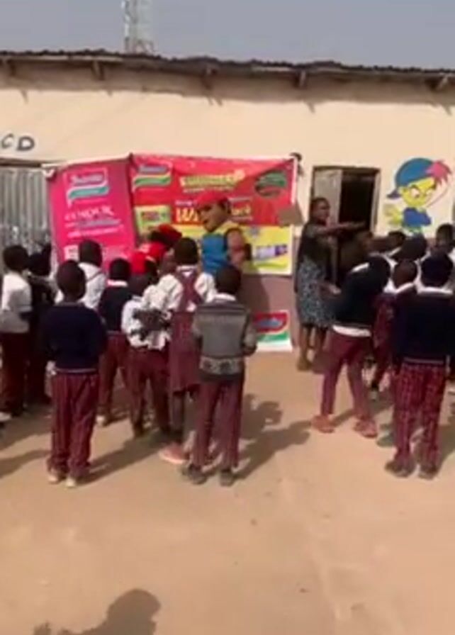 group of children, likely students based on their uniforms, gathered around a banner for "Indomie Colour" at what seems to be a school or community event. The children are mostly dressed in white shirts and red plaid pants or dresses. Some of them are wearing sweaters. There are at least two adults present, one of whom appears to be leading some form of activity or dance. A person in a mascot costume is dancing with the children. A building is behind the group and a cell tower can be seen in the distance. The setting appears to be outdoors on a bright day.