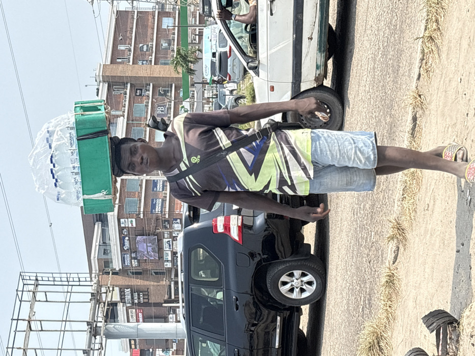 An adult male with dark complexion is captured in a full-body shot, walking or standing on an unpaved, dusty shoulder next to a paved road in Alaguntan, Lekki, Nigeria