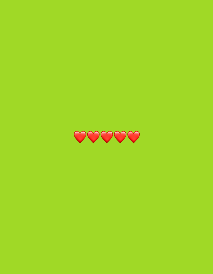 The image displays a uniform, solid lime green background. Centered horizontally within this background are five identical red heart emojis, arranged in a contiguous row. Each heart exhibits a glossy, three-dimensional appearance. No people, physical objects, actions, or interactions are depicted. The environment is an abstract color field. The image contains no visual information that indicates a specific physical location, including any area within the city of Schwechat, Austria.