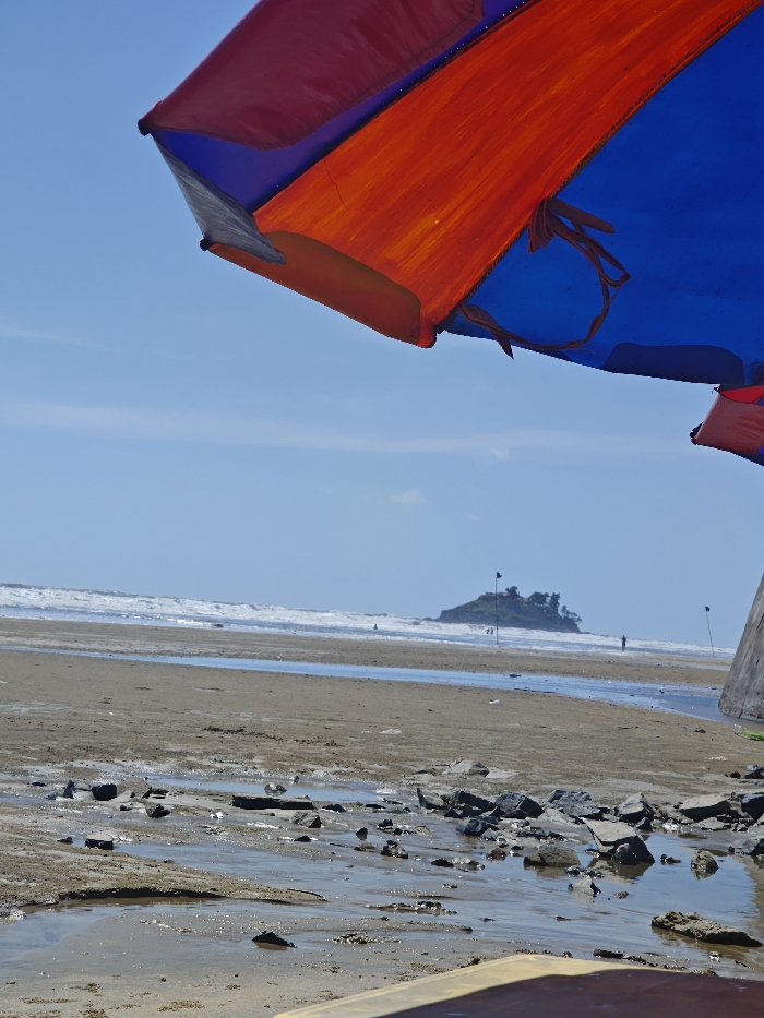 Under a colorful umbrella, a beach scene unfolds. The foreground features wet sand with scattered rocks and small pools. In the distance, waves crash along the shore. An island with a flag atop is visible further out, framed by the ocean and the blue sky above. The sky is clear with a faint wisp of clouds.