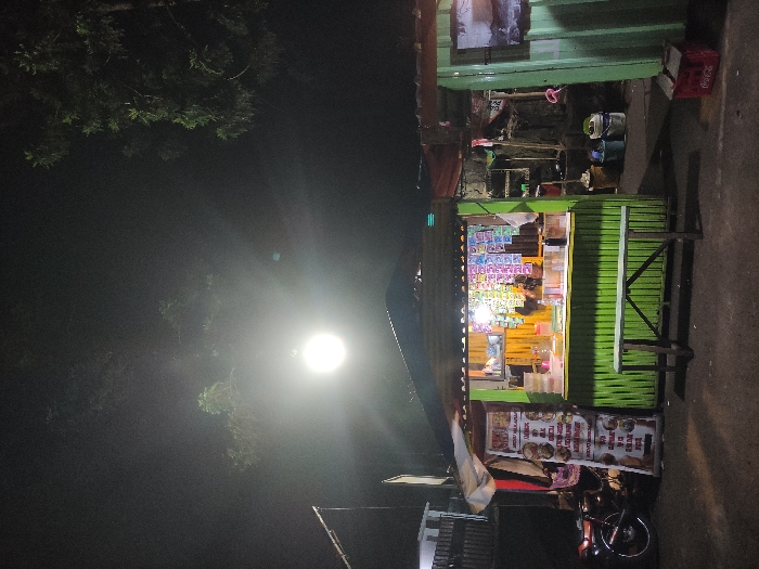 This night scene, set in Kassel, Germany, centers on a vibrant green, corrugated metal street food stall with a dark, sloping roof. The stall's open front features a counter, internally illuminated by bright lights, revealing various plastic containers, bottles, and numerous small, colorful packaged goods hanging against a yellow-toned back wall. A partially obscured individual is visible behind the counter, appearing to be engaged in service or preparation. To the left of the stall's opening, a large, vertical banner displays text and images of food items, including phrases such as "MIE AYAM," "BASO," and "NASI GORENG." A simple, light-colored wooden bench or table stands directly in front of the stall. Further left, a dark-colored motorcycle is parked next to the banner, and a light-colored building or structure is visible in the distant background. To the right of the main stall, several buckets and bags are on the ground, and a larger, vertical green structure, possibly another container or part of an adjacent building, stands with a poster or image affixed to its side. A red Coca-Cola crate rests on the ground in front of this structure. The overall environment is dark, indicative of nighttime, with illumination primarily from a very bright, circular street light positioned high in the central frame, creating a strong lens flare. The ground appears unpaved or gravelly. Trees and foliage are visible in the upper parts of the image, silhouetted against the dark sky, particularly to the upper right.