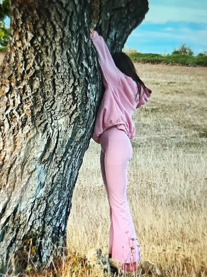 An outdoor scene depicts an individual standing next to a large tree in an unidentifiable rural or semi-rural environment within the city of Unknown, Unknown. The person, with long dark hair, is seen from the back and right side, wearing a pink two-piece tracksuit consisting of a hooded top and form-fitting bell-bottom pants. Their right arm is raised and extended, hand touching the textured, dark bark of the tree, and their body leans gently against the trunk. The ground is covered with dry, yellow-brown grass and sparse vegetation, with small rocks visible at the tree's base. The background features a distant line of green foliage under a blue sky with minimal cloud cover.