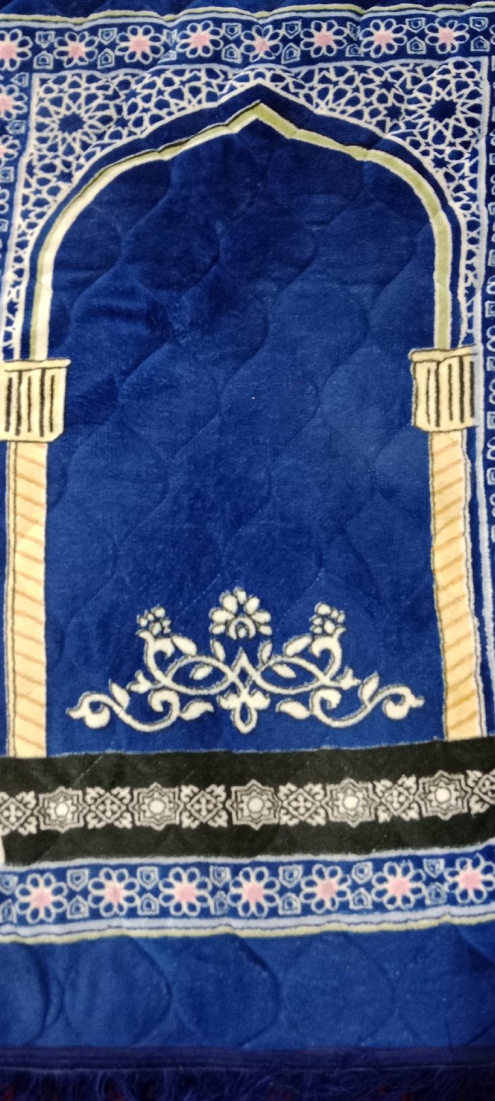 A blue, plush prayer rug features a mihrab arch design at the top, flanked by decorative columns