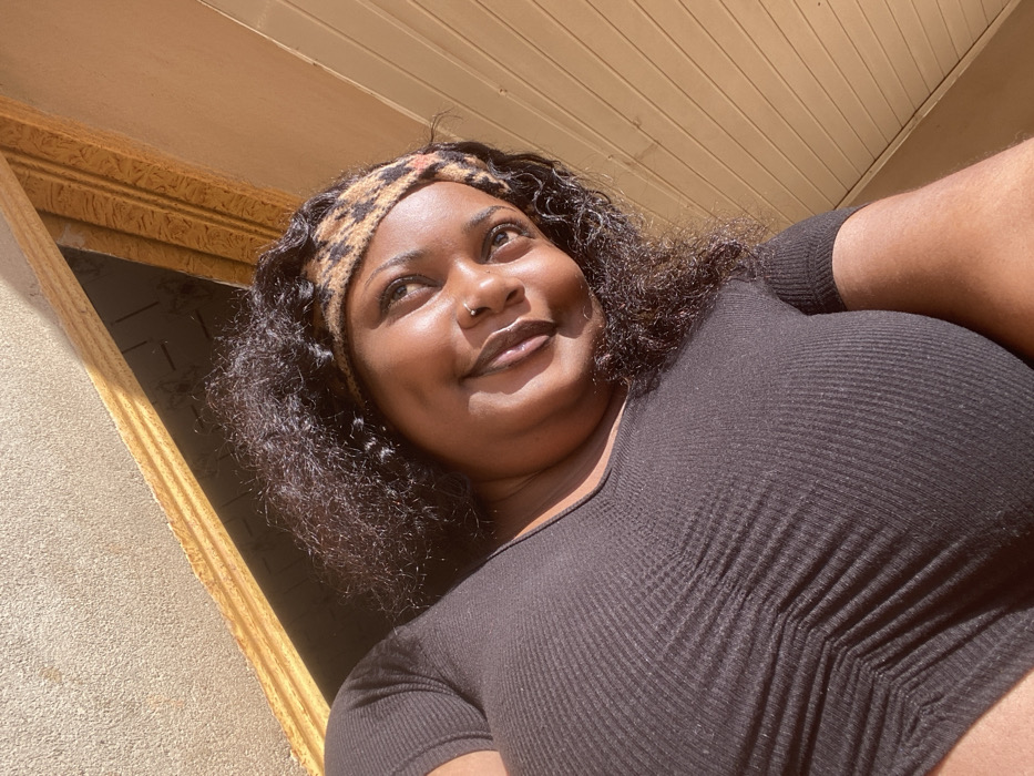 One adult female is depicted in a low-angle, head-and-torso shot, captured in Rido, Nigeria. The subject has dark skin, dark curly hair, and wears a leopard print headband. She is attired in a dark, ribbed, short-sleeved top with a V-neck and ruched left-side detailing. A small metallic stud is present in her right nostril. Her lips are covered with a dark cosmetic. She presents a slight smile and looks upward and to the right. The background consists of a rough, light-colored wall surface to the upper left and smooth, light-brown horizontal wooden paneling to the upper right, joined by a golden-colored wooden trim. The scene is brightly illuminated by direct sunlight.