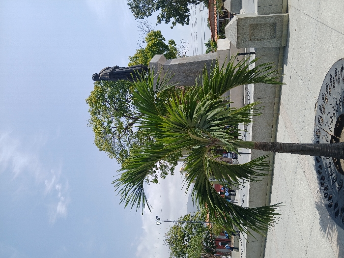 The image depicts a sunny outdoor scene within a public plaza in San Joaquín, Venezuela. In the foreground, a slender palm tree with vibrant green, spiky fronds stands centrally, its base surrounded by a circular, dark-colored metal grate featuring an ornate pattern. The ground is paved with light-grey, square or rectangular pavers. To the right and slightly behind the palm tree, a prominent light-grey stone monument rises, topped by a dark-colored statue. The statue portrays a standing human figure, cloaked in draped robes, viewed primarily from its rear-right aspect, facing away from the camera. The monument includes additional matching stone structures, possibly low walls or benches, extending to its right. In the mid-ground and background, lush green trees with dense foliage are visible, particularly behind the monument and extending across the upper portion of the frame. On the far left, several individuals are discernible, some appearing to wear dark blue uniforms, near structures with reddish roofs. A street light pole is also visible on the left. Distant, hazy mountains are faintly visible on the horizon, beneath a clear, pale blue sky with sparse white clouds.