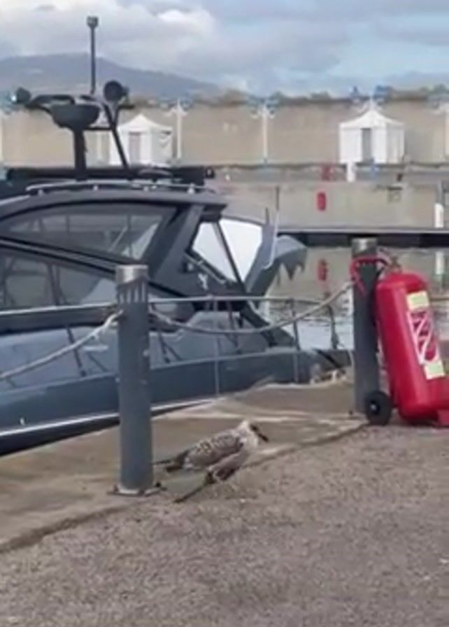 A short video depicts a seagull on a paved dock alongside a harbor. A dark-colored modern yacht is docked nearby, held by mooring lines. A red fire extinguisher on wheels leans against a mooring post. Behind the yacht and dock is a concrete wall, with white tents set up on the other side. In the background, mountains are visible under a cloudy sky. A person is briefly visible near the boat, and a voice speaks in a language other than English.