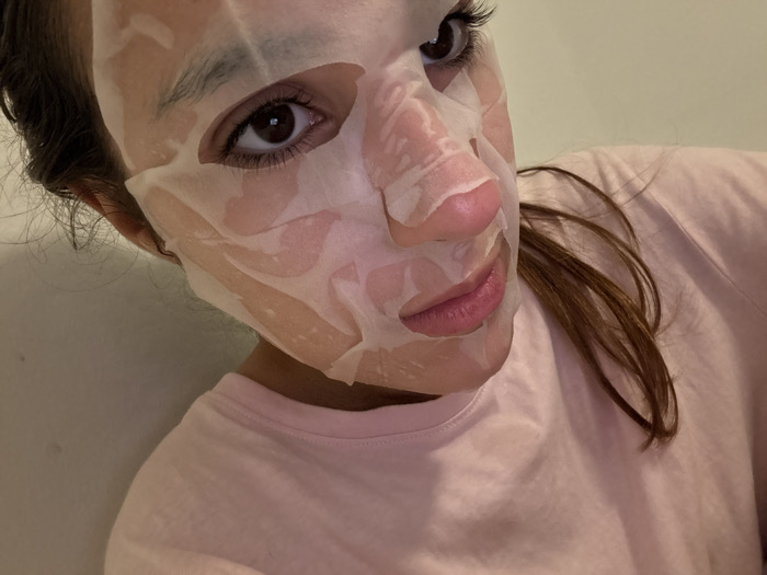 A human female is depicted in a close-up, slightly angled portrait, taken indoors in Plasencia, Spain. Her face is covered with a white, translucent sheet mask, which has apertures for her dark brown eyes, nostrils, and pink lips. Dark brown hair is visible, falling over her right shoulder. She is wearing a light pink, possibly cotton, crew-neck garment. The immediate background consists of a plain, light-colored wall. The subject's gaze is directed towards the camera.