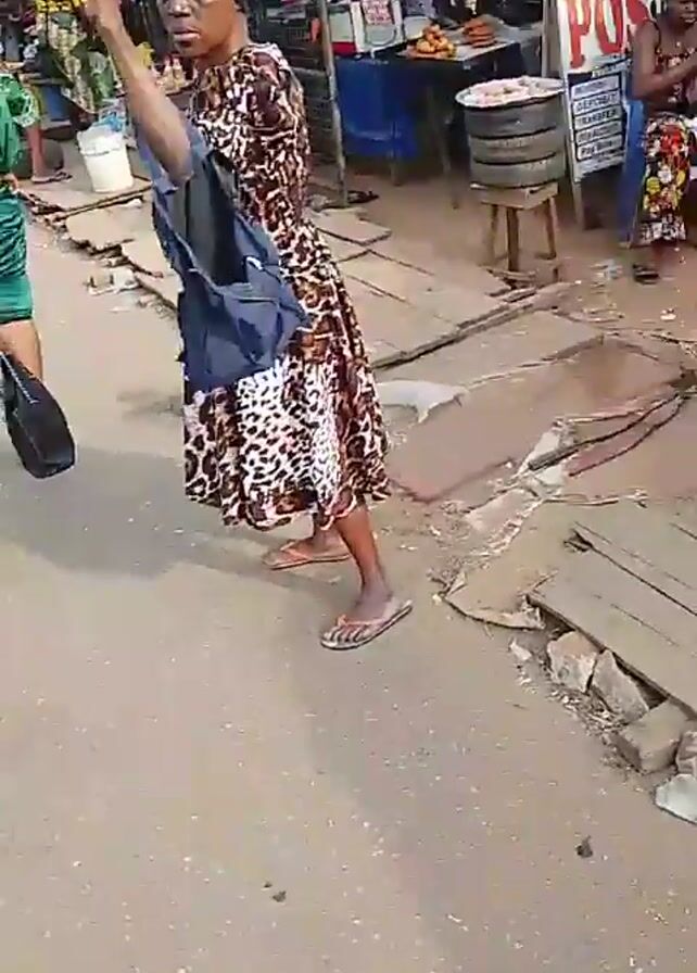 The video, taken from a low angle, shows three women walking along a paved road. The woman in the foreground wears a brown and black animal print dress and slides. She has a blue bag slung over her shoulder. To her left is a woman wearing a green dress. The last woman is wearing a yellow shirt, denim shorts, and sandals. She carries a black purse in her left hand. The road has some debris along the edges. The perspective suggests the video is taken from a low-riding vehicle. The top of the dashboard is visible in the lower part of the frame.