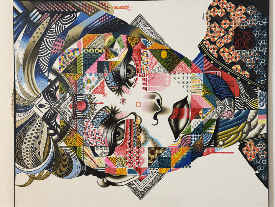 The artwork portrays a sideways, abstracted face with geometric and patterned fills. Eyes, a nose, and a stylized lip are discernible. The subject's hair, background, and parts of the face are composed of triangles and squares featuring diverse designs, including floral motifs, stars, stripes, and other abstract shapes in a vibrant color palette. A diamond-shaped border containing intricate patterns outlines the face. The style suggests a blend of cubism and pop art influences.