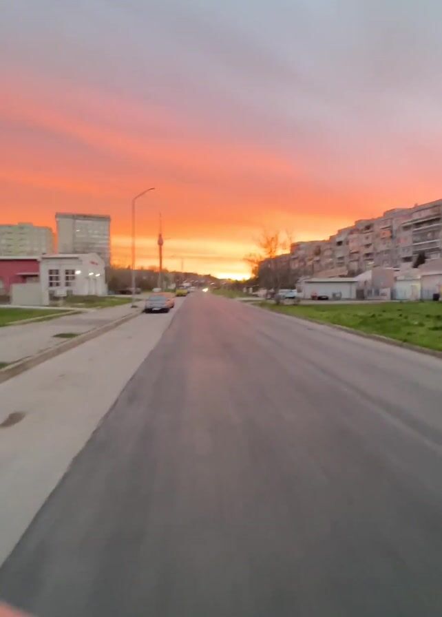 view from a vehicle moving down a grey asphalt road during a vibrant sunset. The sky is painted with hues of orange and red, transitioning to grey at the top. Buildings line the street, and grassy areas are visible on the sides. Cars are parked along the road. The camera appears to be handheld and has some shaking and blurring effects. The overall setting seems to be a quiet suburban area during dusk.
