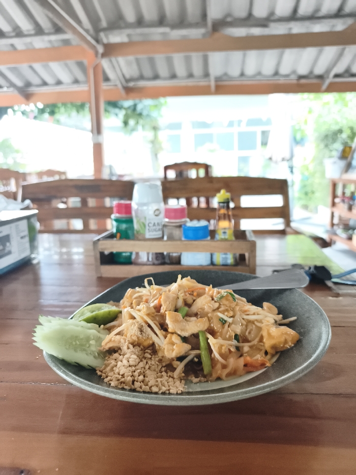 A plate of Pad Thai sits on a wooden table, adorned with a lime wedge, cucumber, and crushed peanuts. Noodles, bean sprouts, tofu, and chicken mix with a savory sauce. Behind the plate, a wooden condiment holder houses various seasonings. Sunlight streams through the open-air restaurant with wooden benches and a white roof structure. The scene captures a casual, delicious moment.