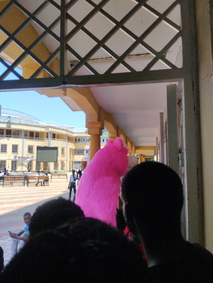 The image depicts an outdoor plaza scene in Thika, Kenya, viewed from a shaded interior space. In the immediate foreground, the out-of-focus dark heads of at least two individuals are visible, partially obscuring the lower central portion of the frame. Above them, a dark metal lattice with a diamond pattern is present against a white ceiling. In the midground, a large, bright pink, furry mascot costume, resembling a bear and facing away from the camera, is positioned under a covered walkway. This walkway features yellow supporting pillars and a white ceiling. Another individual's dark head is partially visible to the right of the mascot. The background reveals a sunlit outdoor plaza paved with patterned light and dark tiles. Several wooden benches with metal frames are arranged, some occupied by individuals. A person in light clothing walks across the plaza. The far background is dominated by a multi-story, light-colored building with numerous windows and a large, dark display screen mounted on its facade, all under a clear blue sky.