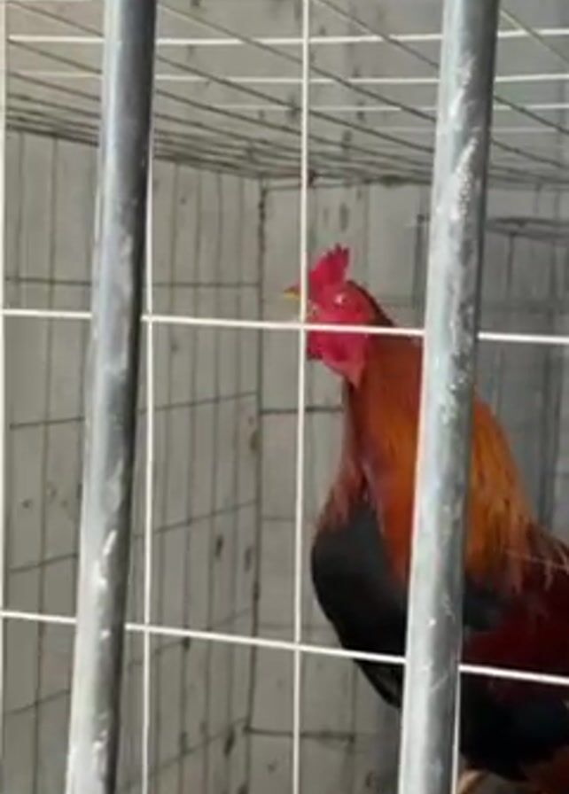 A rooster is shown in a gray wire cage, partially obscured by gray metal bars