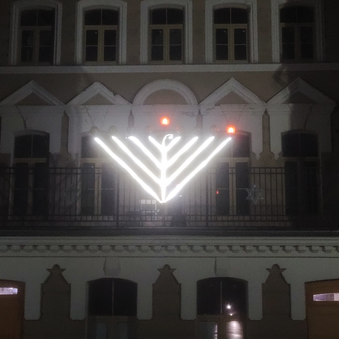 - "A brightly lit menorah decorates a building at night" by FM-TzA0d2, licensed under CC BY 4.0