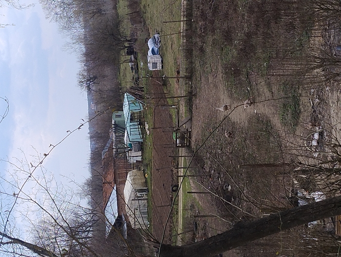 This image, taken in Dolno Linevo, Bulgaria, depicts a semi-rural, outdoor scene, likely a residential property or smallholding, under an overcast sky. The foreground is partially obscured by the bare branches of a large tree on the left and smaller branches extending across the top. The ground in the foreground consists of dry vegetation, dirt, and scattered debris. In the midground, a dirt path traverses the scene from the lower right towards the middle left. Three domestic geese are visible on or near this path: one large white goose stands upright, facing left, while two smaller, brownish geese are positioned to its left, appearing to forage. A rudimentary fence, constructed from posts and wire, delineates sections of the property. Directly behind the path is an area of tilled brown earth, indicating a cultivated garden plot. Various structures are present, including a white, semi-translucent plastic or fabric-covered hoop house/greenhouse and a teal-colored, metal-framed structure, likely another greenhouse or shed. Further right, a white utility structure and bundled materials are visible on the ground. The background features several buildings: a prominent reddish-brown brick structure with a tiled roof, and an adjacent building with a corrugated metal roof. Other smaller sheds and outbuildings are scattered amongst bare deciduous trees. Beyond these structures and trees, a distant, faint urban or town silhouette is discernible against the pale, cloudy sky. No human figures are present.